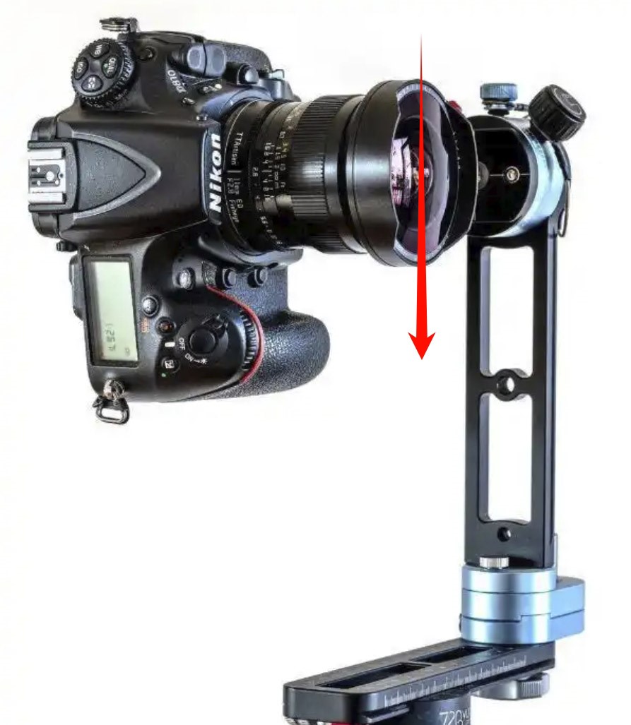 在我们进行张家港VR全景拍摄的过程中,除了部分要求不高的使用VR全景相机外,张家港专业的都是用专业相机,我们在使用专业相机的时候,必不可少的就是VR云台,在长时期用过VR云台的人我想都会遇到一个相当无语的问题:拍摄过程中会出现相像镜头向正下文下垂,如下图箭头方向下垂。